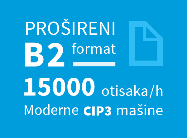 Naš jezik su boje. A komuniciramo ofset štampom, štampom najvišeg kvaliteta. Zahvaljujući najsavremenijim mašinama CIP3 generacije, proces proizvodnje je automatizovan i znatno ubrzan. Štampa se na proširenom B2 formatu pri maksimalnoj brzini od 15000 otisaka po satu, na standardnim ili specijalnim papirima.